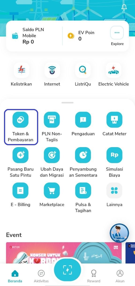- Jika sudah mengunduh dan daftar / login, pilih menu token dan Pembayaran